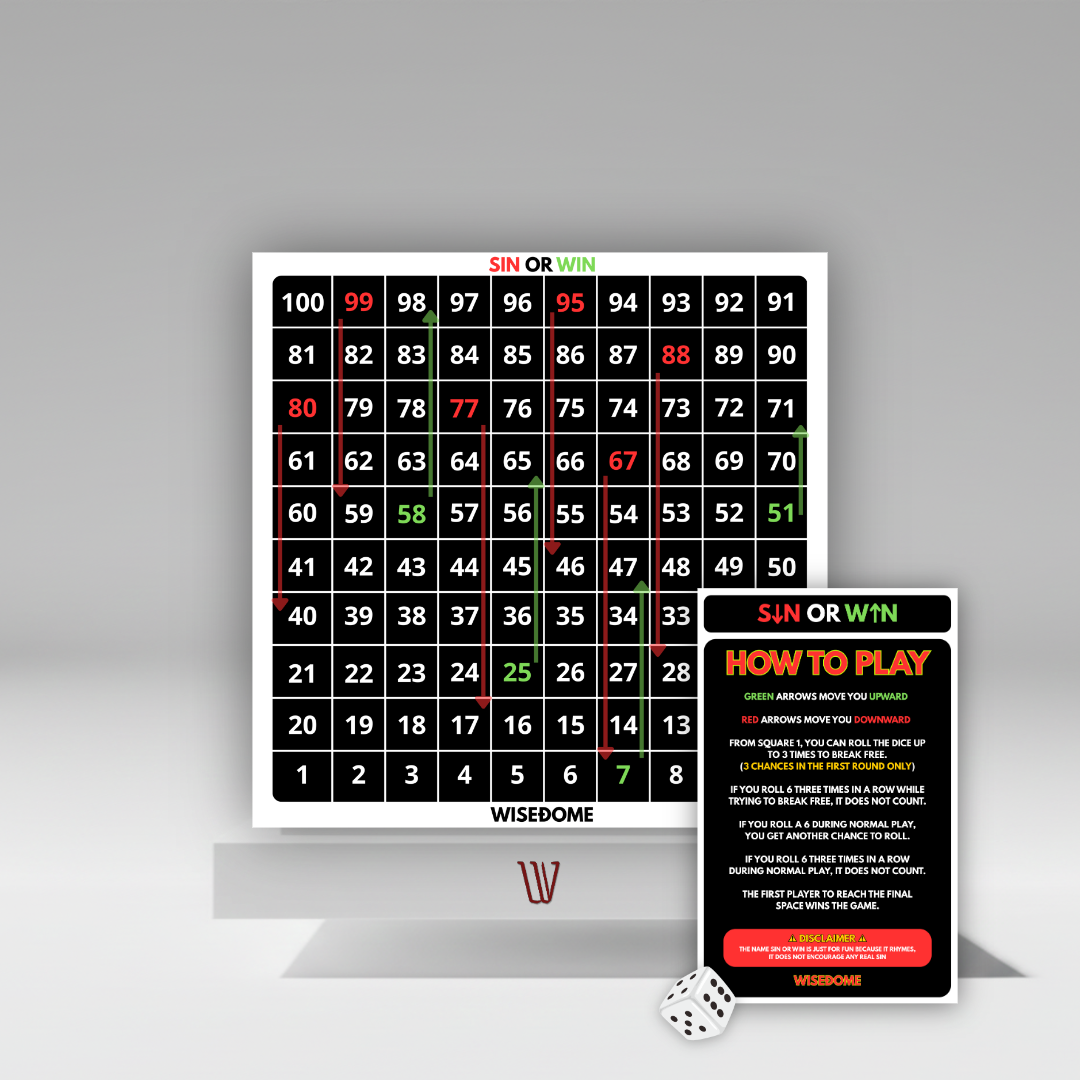 Sin or Win is an exciting board game inspired by the timeless snakes and ladders style, designed purely for fun and entertainment. Players navigate the board by making moves that either help them advance quickly or pull them back, creating suspense and laughter in every round.